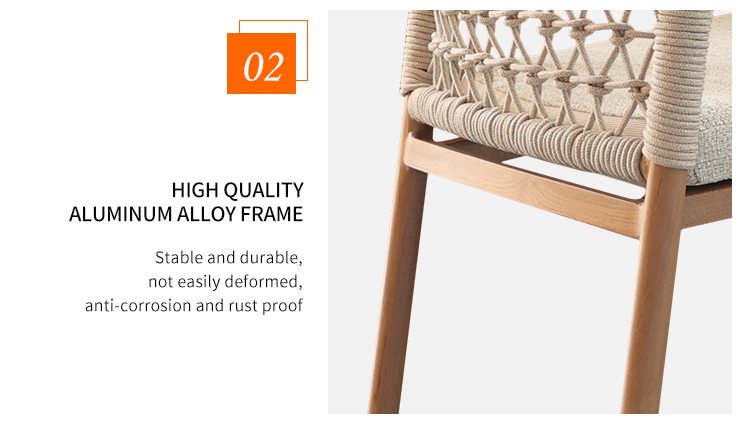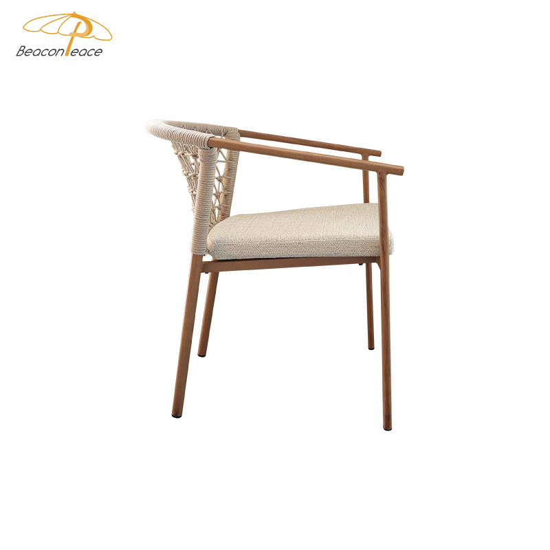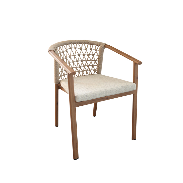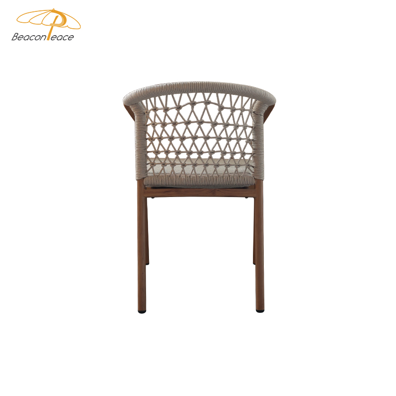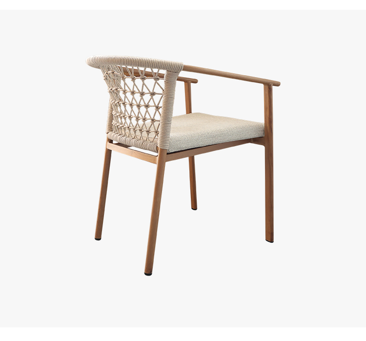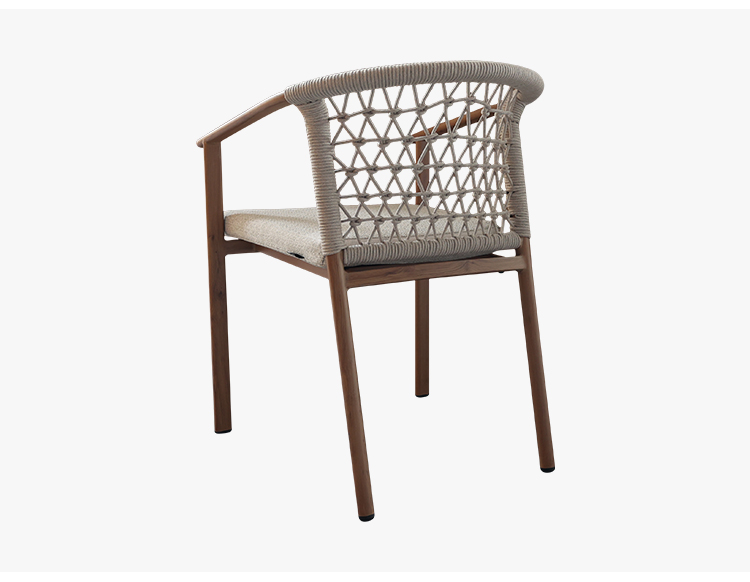 This outdoor aluminum alloy chair is based on an aluminum alloy thermal transfer wood color frame, which not only shows the warmth of natural wood grain, but also has the lightness and durability of aluminum alloy. The armrests are designed to be comfortable and provide better support, while the exquisite rattan decoration on the back adds a touch of elegance and fashion. Whether in an outdoor restaurant or coffee shop, this chair brings comfort and unique aesthetics to your space, perfectly integrating into every moment of relaxation.