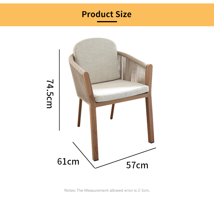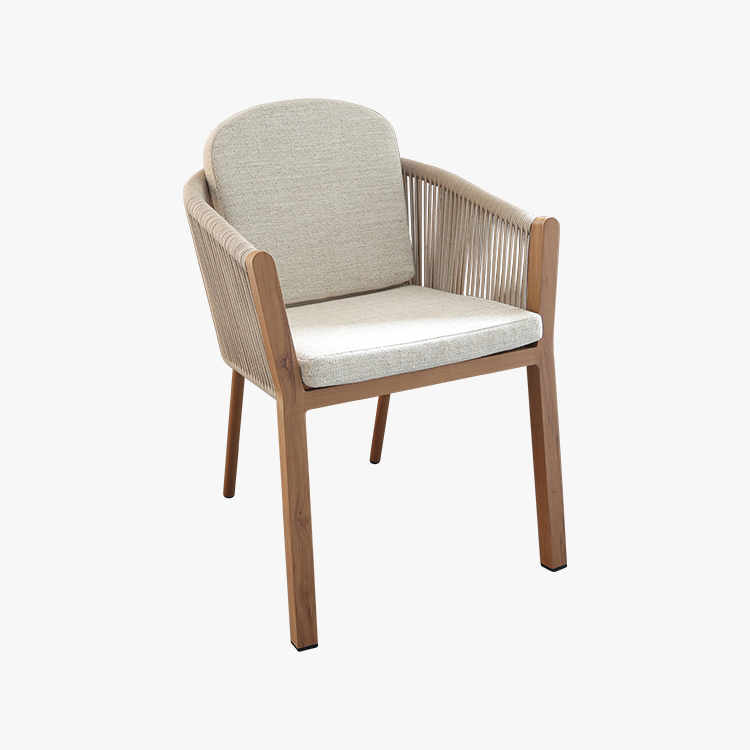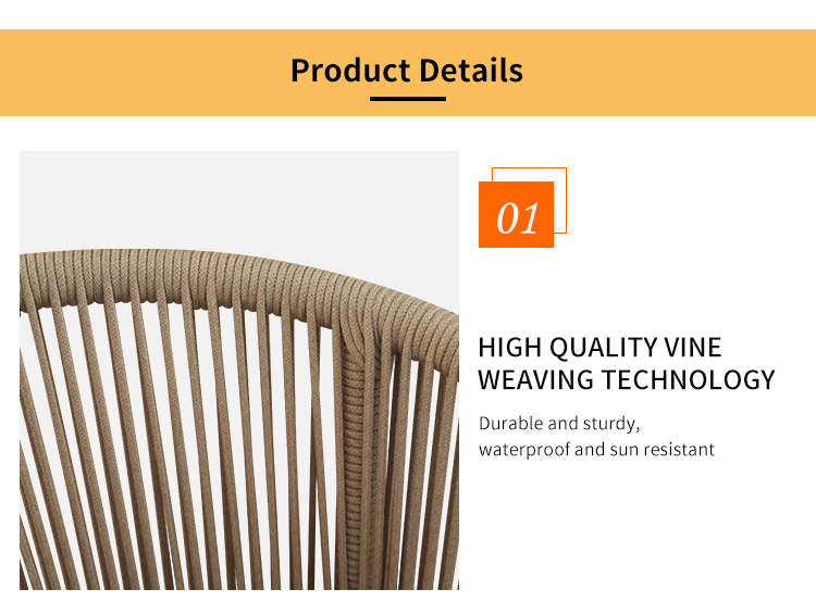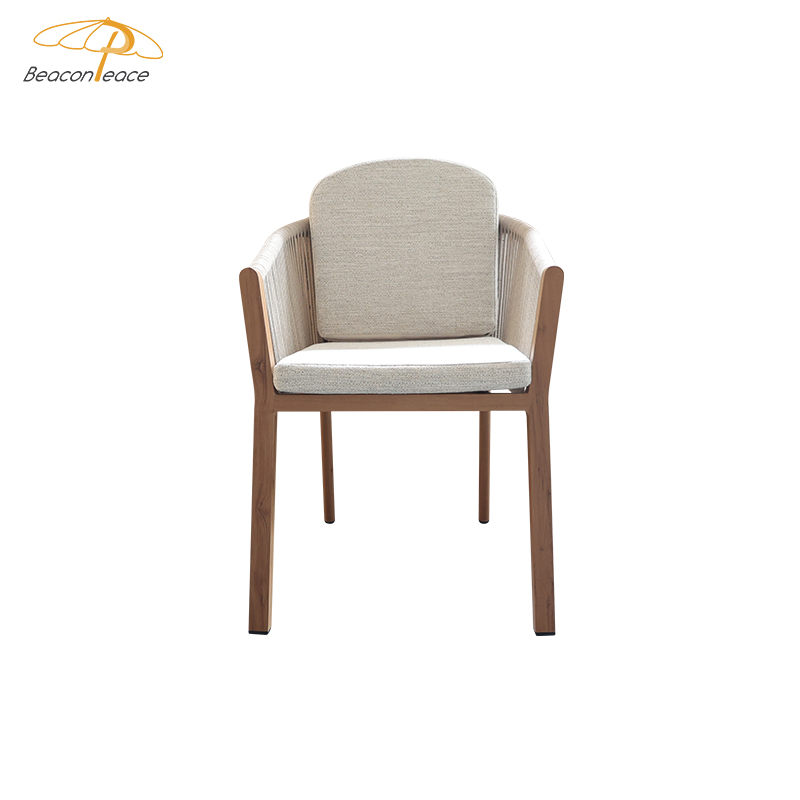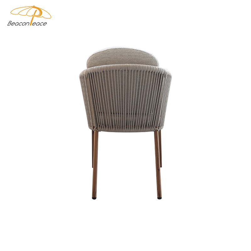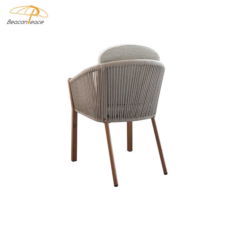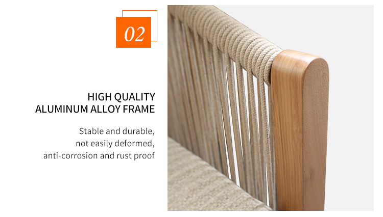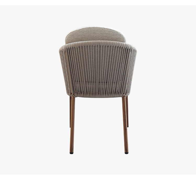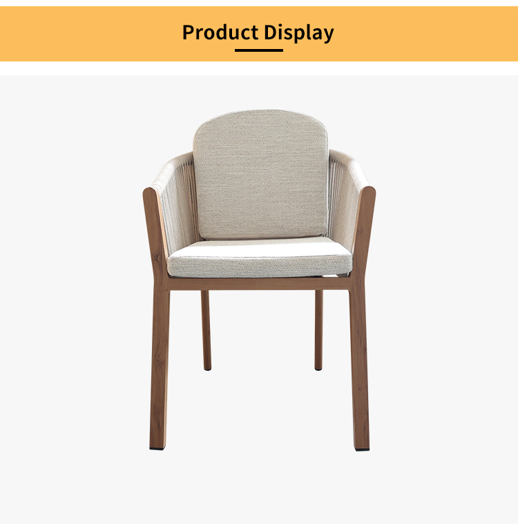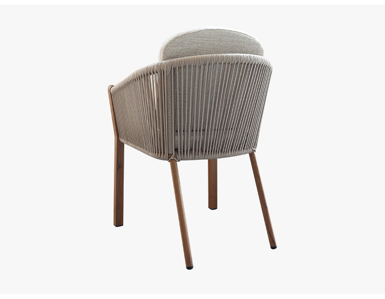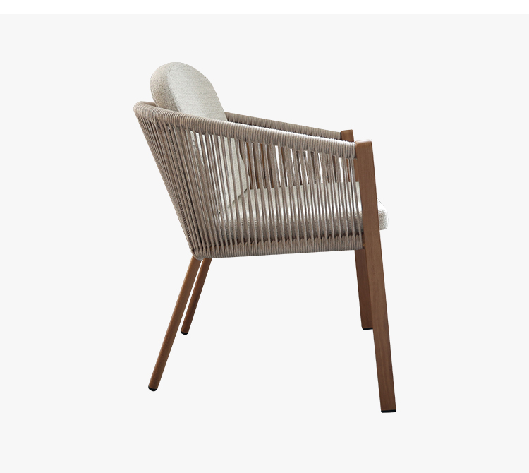 This outdoor chair, featuring a heat transfer wood-colored aluminum alloy finish, is a striking choice for outdoor spaces thanks to its unique design and practicality. The chair's aluminum alloy frame boasts exceptional durability, withstanding the elements and remaining corrosion- and rust-resistant. Adorned with delicate woven rattan and rope details, it exudes a unique artistic flair and visual appeal, blending perfectly into outdoor spaces such as gardens, balconies, or patios. For enhanced comfort, the chair also features a comfortable, waterproof seat cushion, keeping you dry and comfortable even in open-air conditions, making it ideal for extended outdoor use.